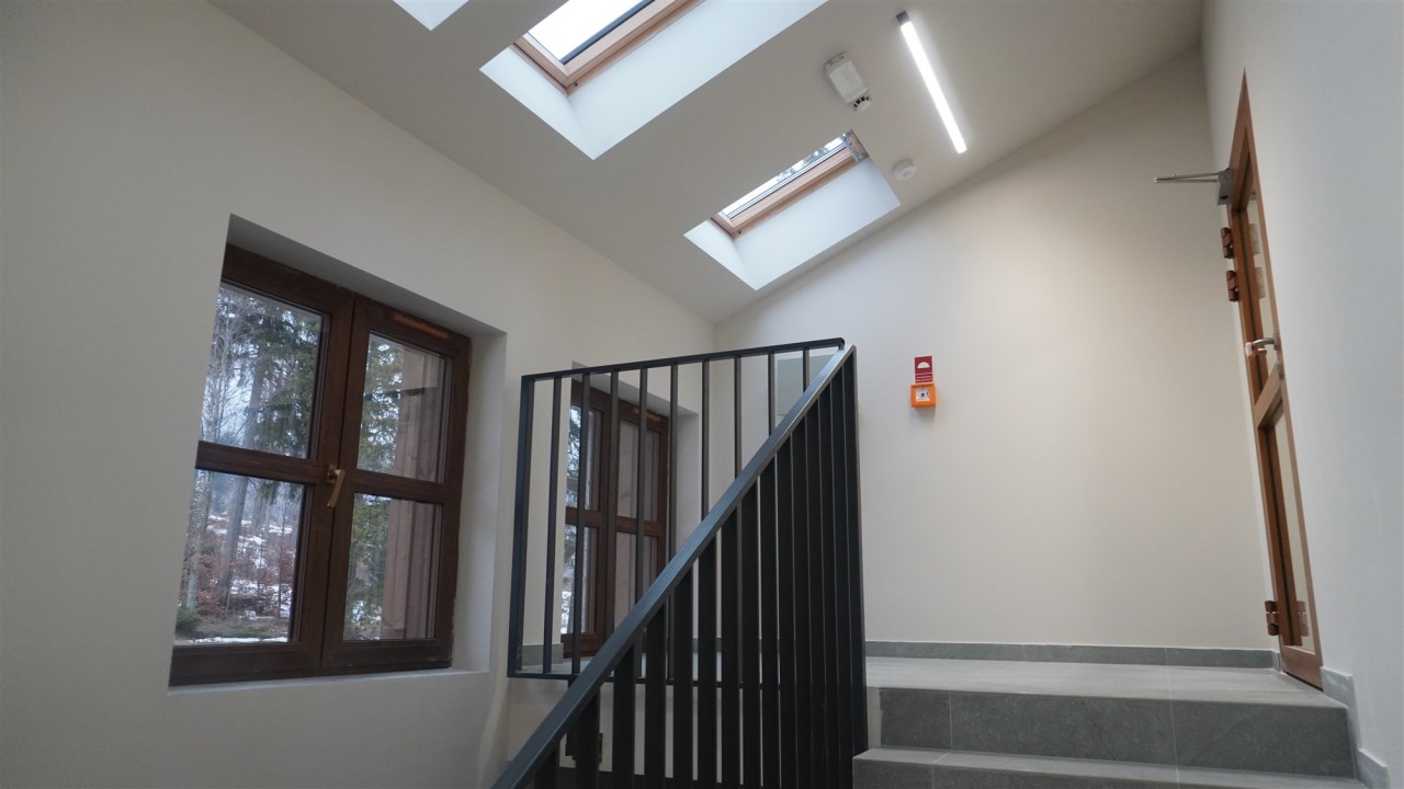 Nowoczesna architektura budynku łączy również tradycyjne formy wykoÅ„czenia jak drewno i kamieÅ„.Â