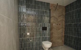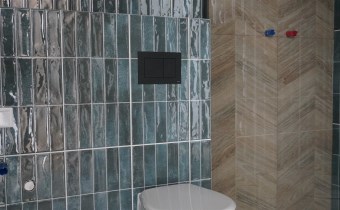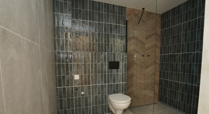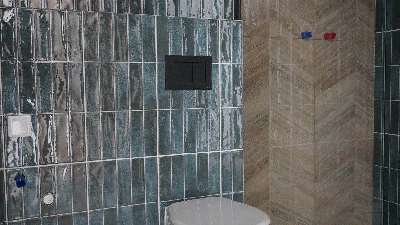 Łazienka gotowa do użytkowania – wykończona wysokiej jakości gresem na ścianach i podłodze.