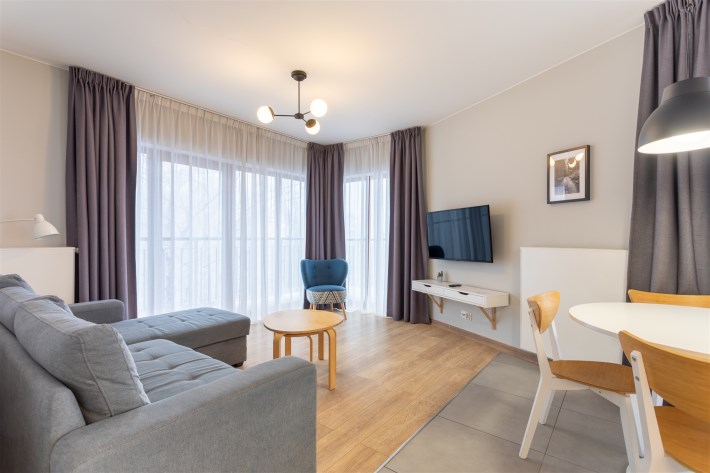 Układ mieszkania został zaplanowany w sposób bardzo funkcjonalny. Apartament składa się z przestronnego pokoju dziennego z aneksem kuchennym, dwóch niezależnych sypialni, łazienki oraz korytarza. Część dzienna tworzy jasną, otwartą przestrzeń sprzyjającą wspólnemu spędzaniu czasu. Duże przeszklenia zapewniają doskonałe doświetlenie wnętrza, a widok na pasmo Karkonoszy buduje wyjątkowy klimat tego miejsca i podkreśla jego górski charakter.