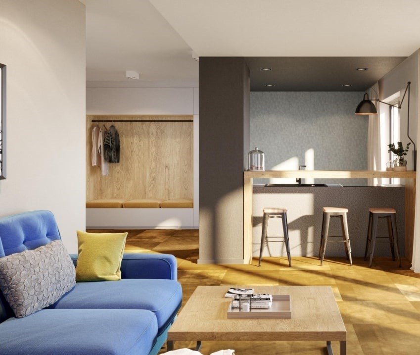 Każdy apartament posiada własny aneks kuchenny, przestronne okna zapewniające maksimum doświetlenia.