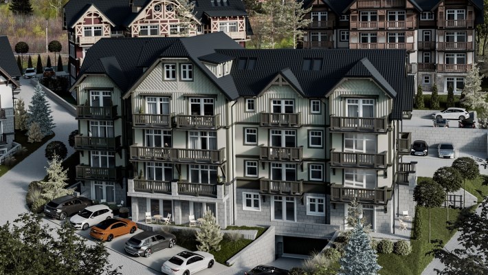 Komfortowe wnętrza budynków zapewniają możliwość wyboru apartamentów w różnej konfiguracjach apartamenty 1,2,3 oraz 4 pokojowe z balkonami / ogródkami, tarasami. W budynkach poza apartamentami mieścić się będzie część SPA z basenem wewnętrznym jacuzzi wewnętrznym, saunami suchymi/mokrymi a także zewnętrzy basen i zewnętrzne jacuzzi atrakcje przeznaczone dla wszystkich Właścicieli apartamentów oprócz tego będzie Recepcja, narciarnie/rowerownie  które w okresie letnim wykorzystywane będą do możliwości pozostawienia wózków dziecięcych dla rodzin z dziećmi.