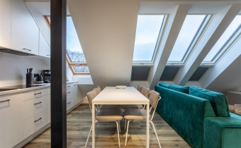 w pełni wyposażonym w niezbędne sprzęty AGD. To przestrzeń, która sprawdzi się zarówno podczas rodzinnych pobytów, jak i w formule wynajmu krótkoterminowego. Z salonu prowadzi wyjście na balkon, z którego rozciąga się na okoliczną zabudowę i górski krajobraz - idealne miejsce na poranną kawę lub wieczorny relaks.